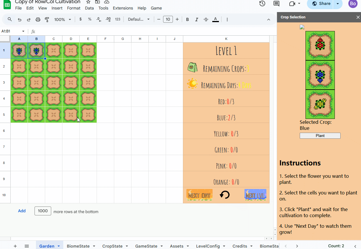 Players select crops (initially red and blue, with others unlocking progressively) and plant them by selecting spreadsheet cells. Each plant type spreads uniquely each day when the "Next Day" button is pressed.Growth Patterns: